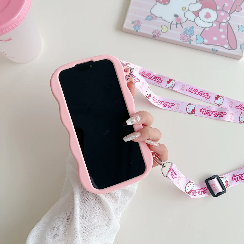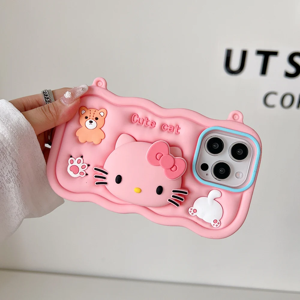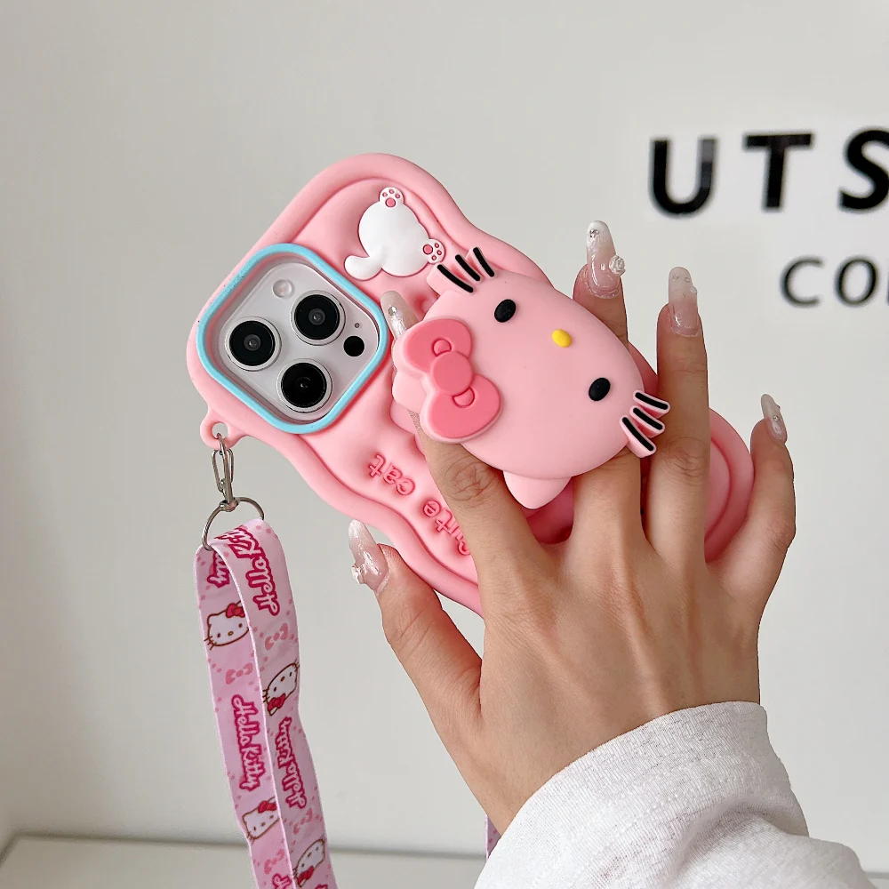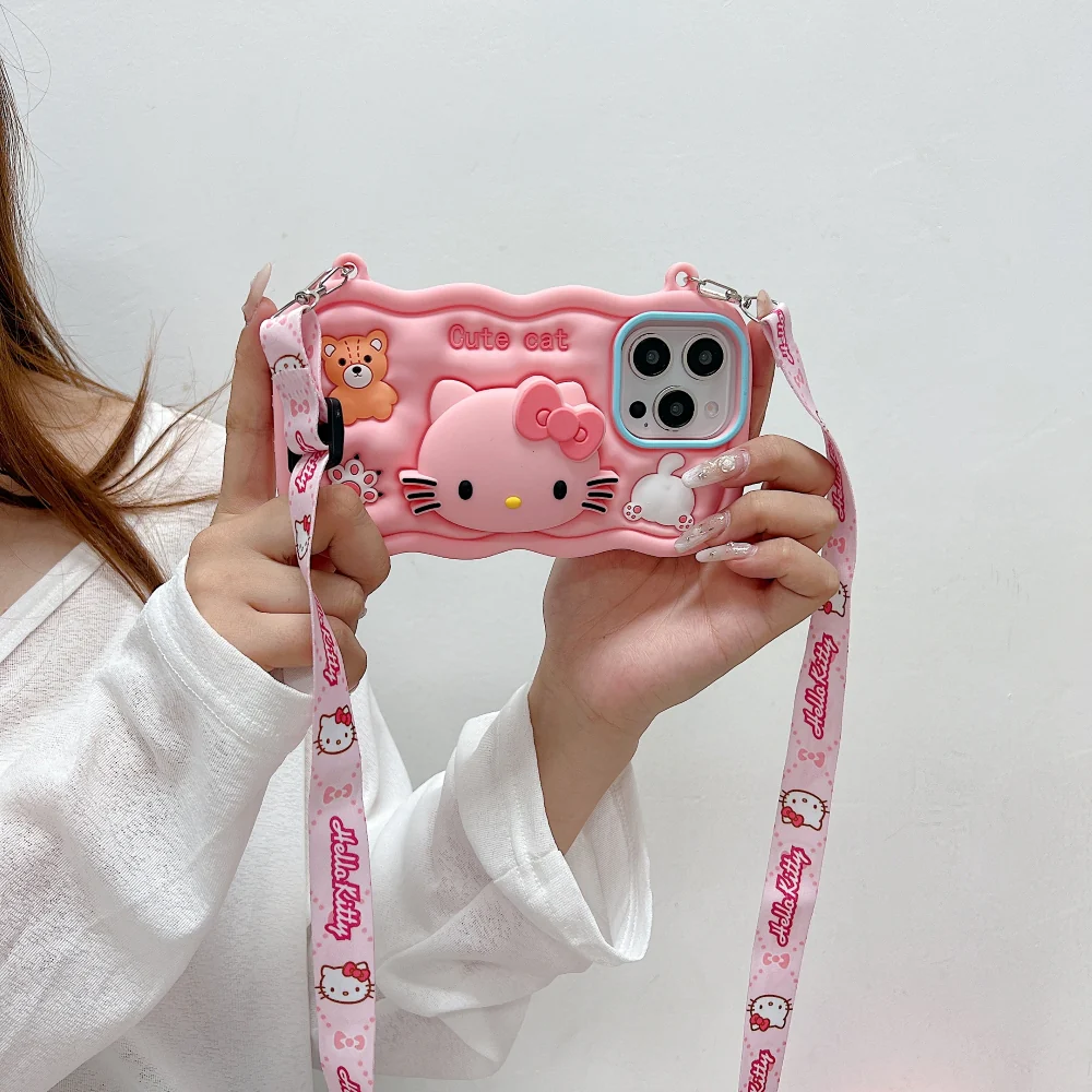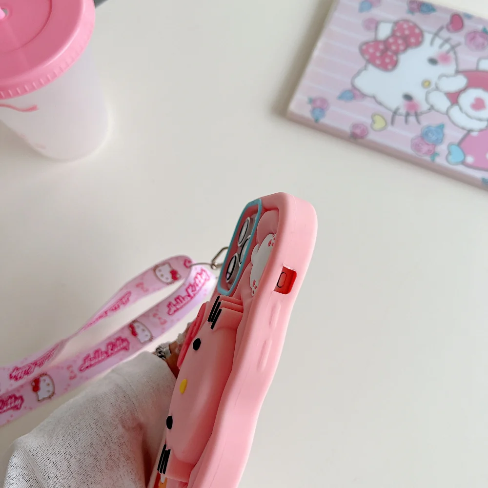 3D Cartoon Hello Kitty Case with Lanyard, Cute Cat Pink Soft Silicone Shockproof Phone Cover with Holder Strap, Stylish Fashion Aesthetic Back Case for Women and Girls (R2BS974)