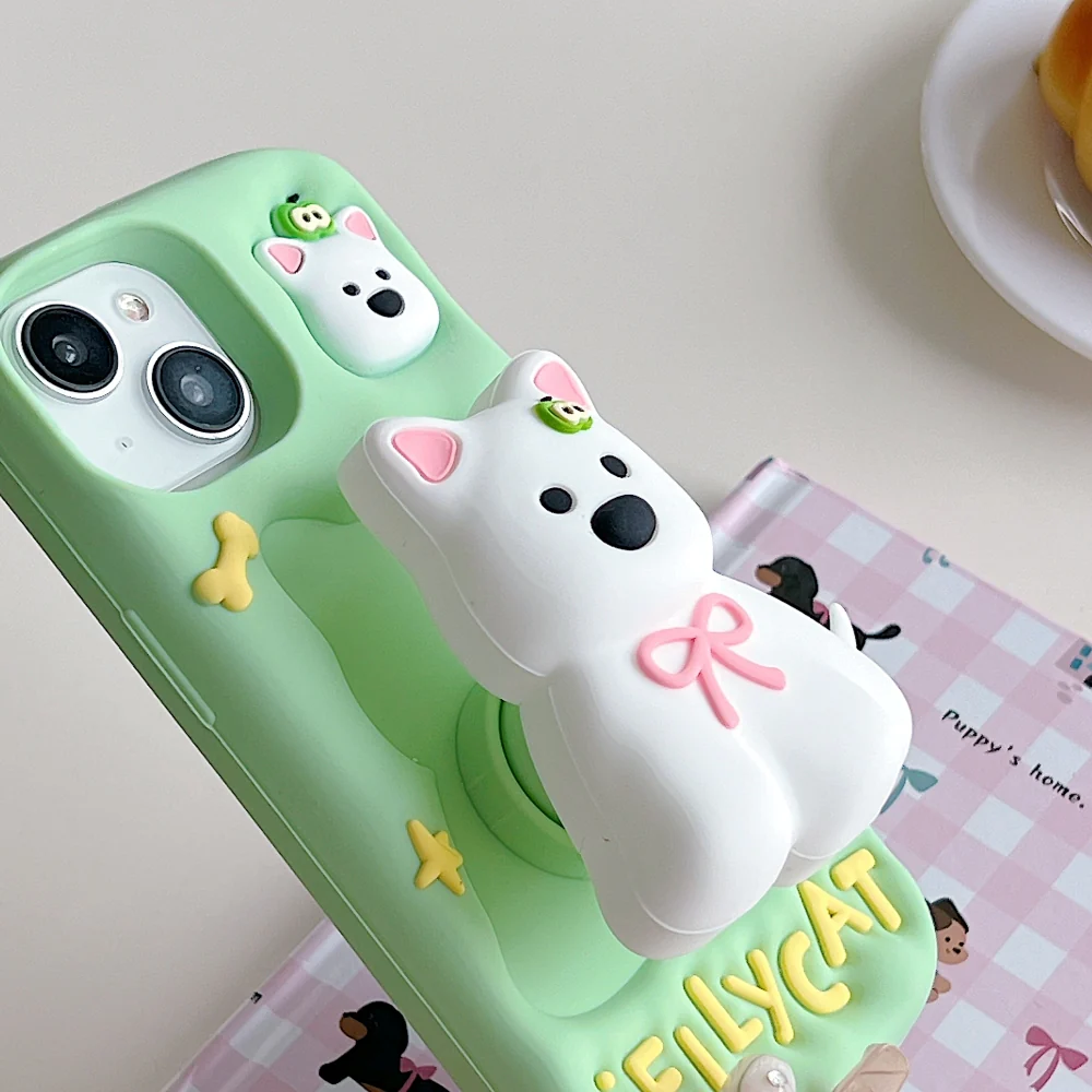 3D Puppy Knot Cartoon Pop Case, Premium Silicone Case Dog Love Light Green Color with Phone Holder Cool Full Protective for Apple iPhone (R2BS981)