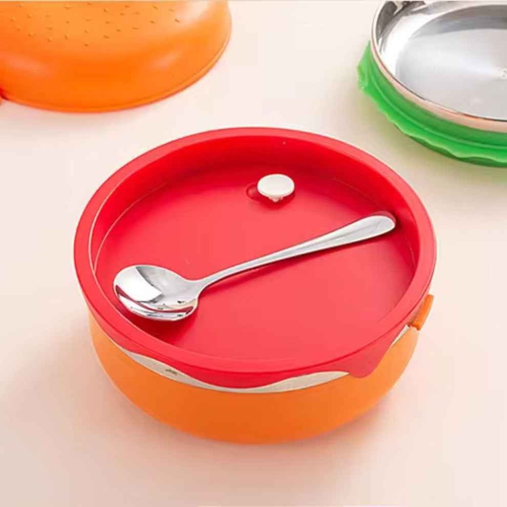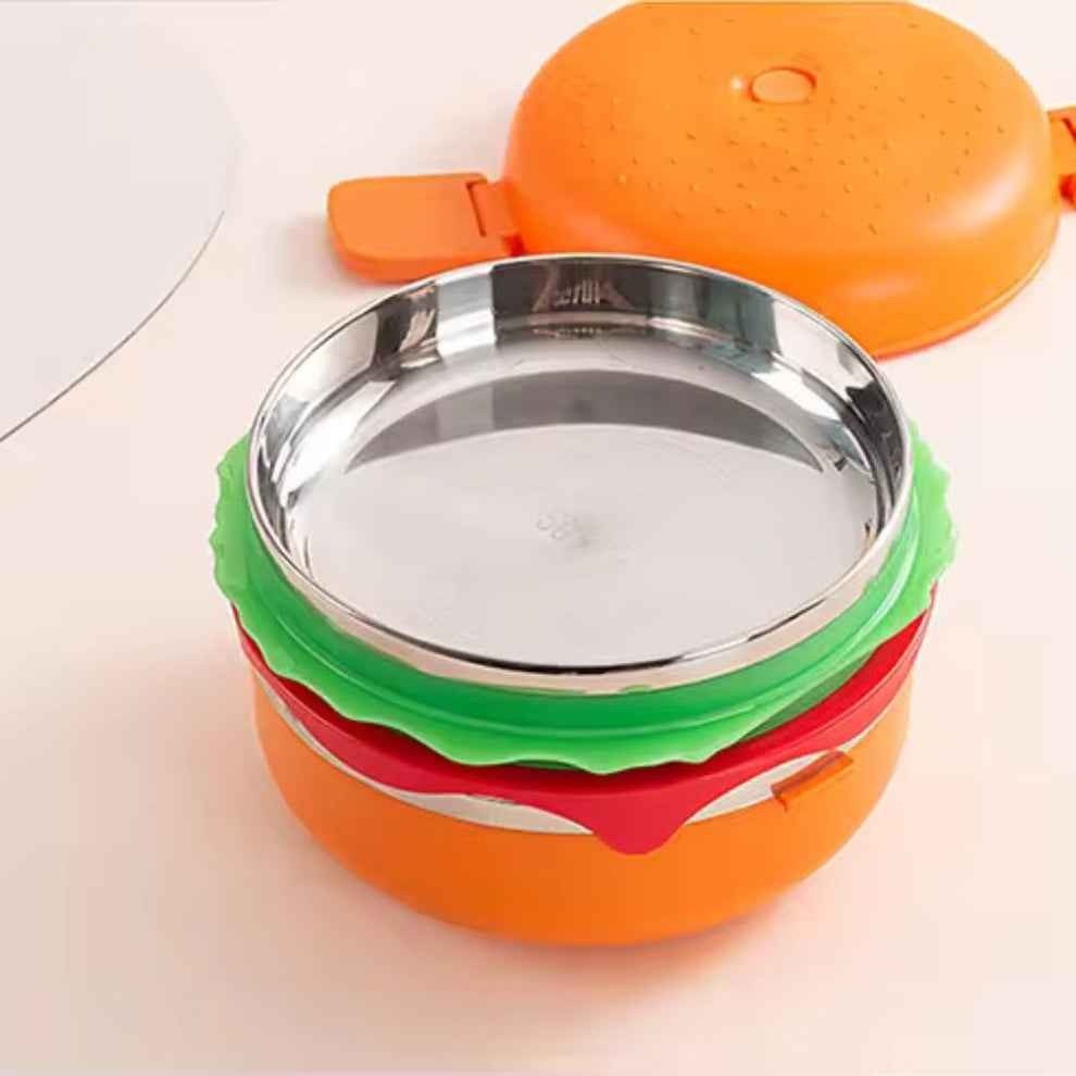 • Introducing our Stainless Steel Double Layered Burger Shaped Lunch Box For Kids, the ultimate solution for hygienic and convenient meal storage!