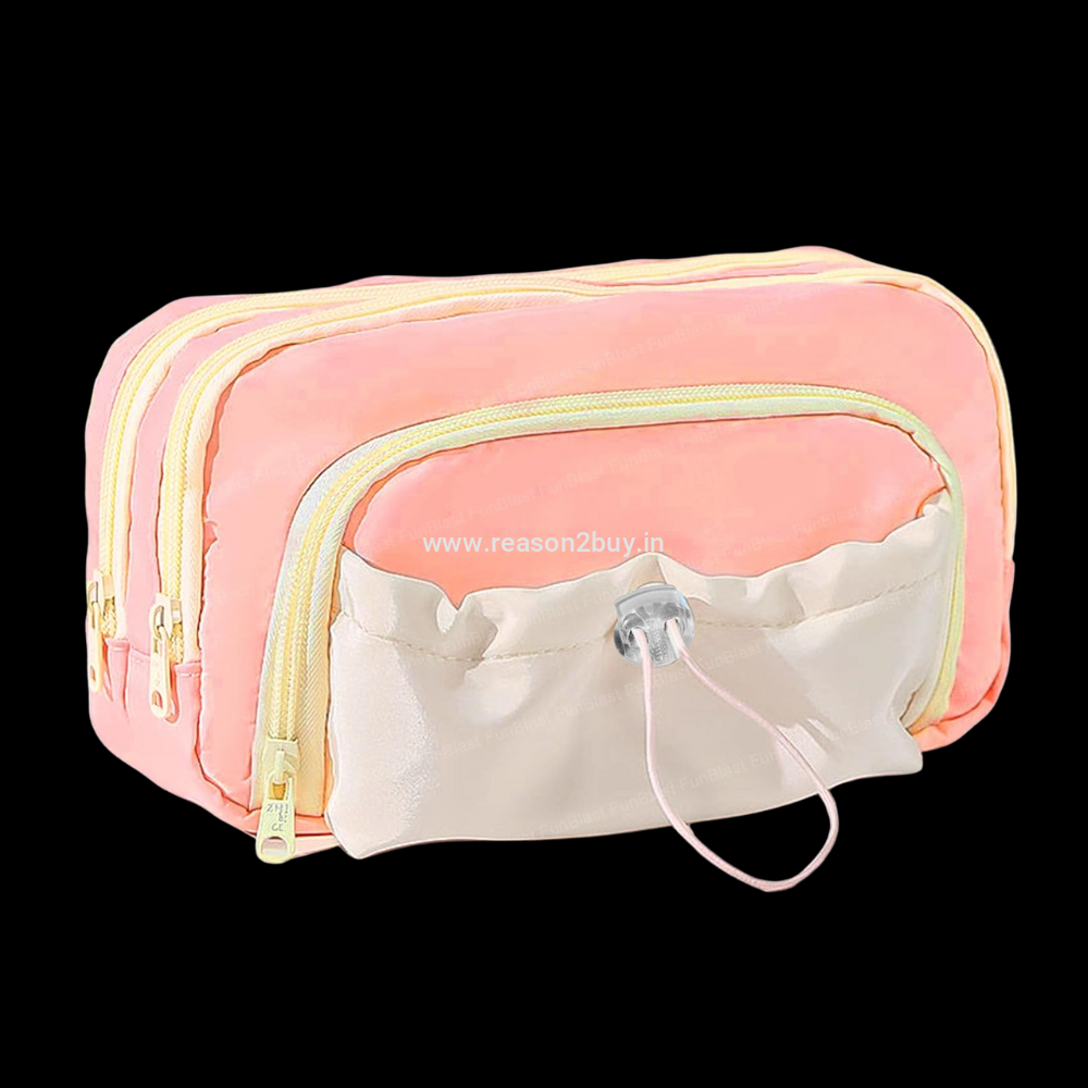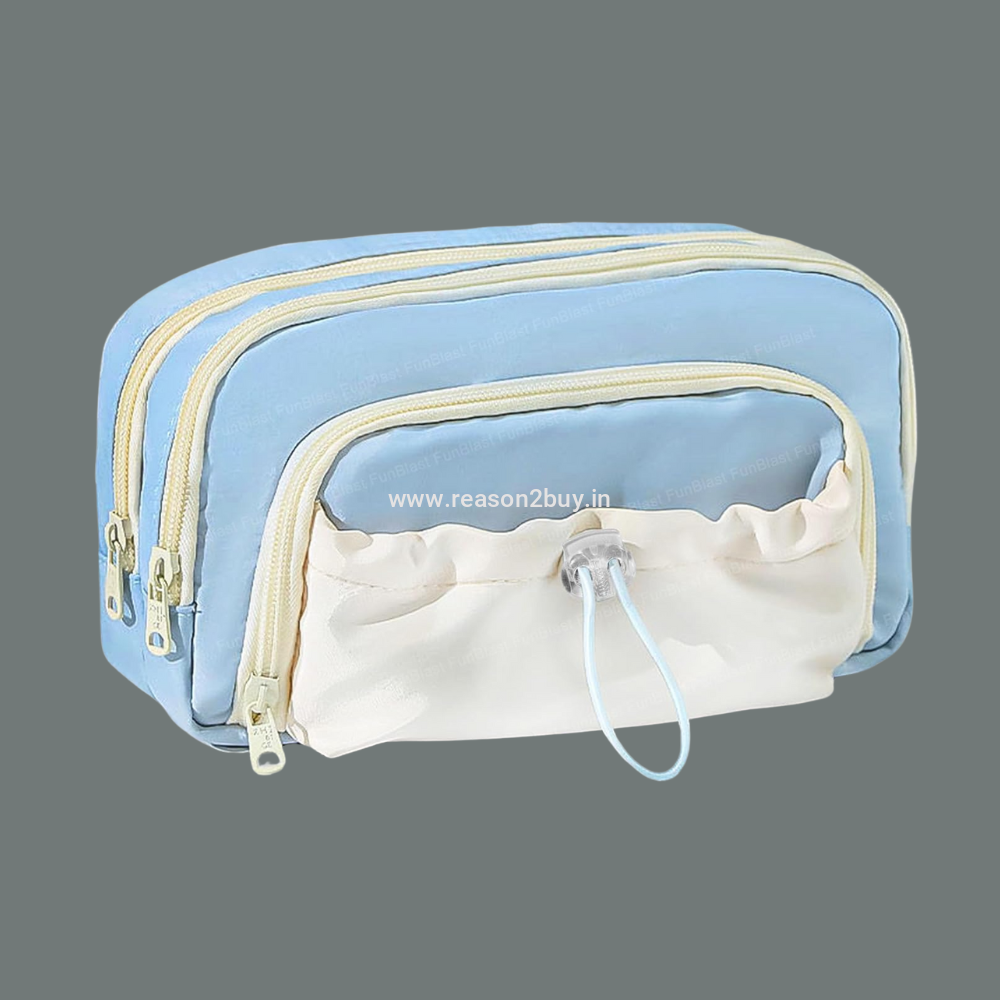 Say goodbye to rummaging through a messy bag. This smartly designed organizer features three main zippered compartments and an extra front drawstring pocket, ensuring every pen, pencil, eraser, and accessory has its own place. Made from premium, durable canvas material, it's built to withstand daily wear and tear from school, college, or office life.