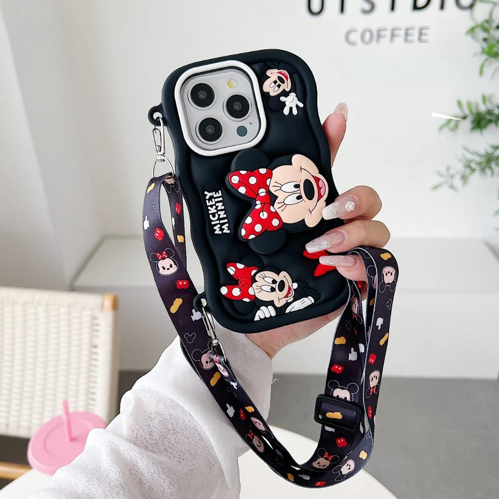 Minnie Cartoon Kickstand Phone Case with Shoulder Strap | Full Protective Soft Silicone 3D Holder Back Cover for iPhone ... -