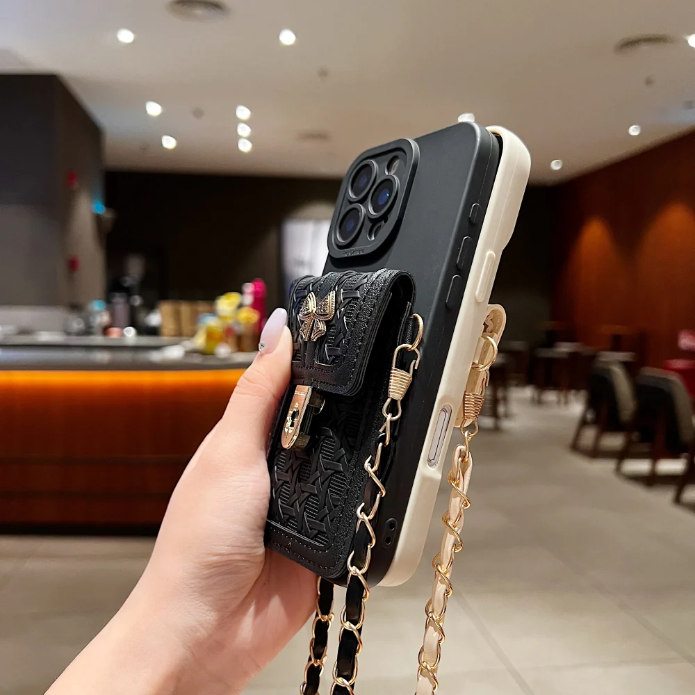 Combines fashion and function with a woven leather pouch, gold accents, and a detachable chain strap – perfect for hands-free convenience!