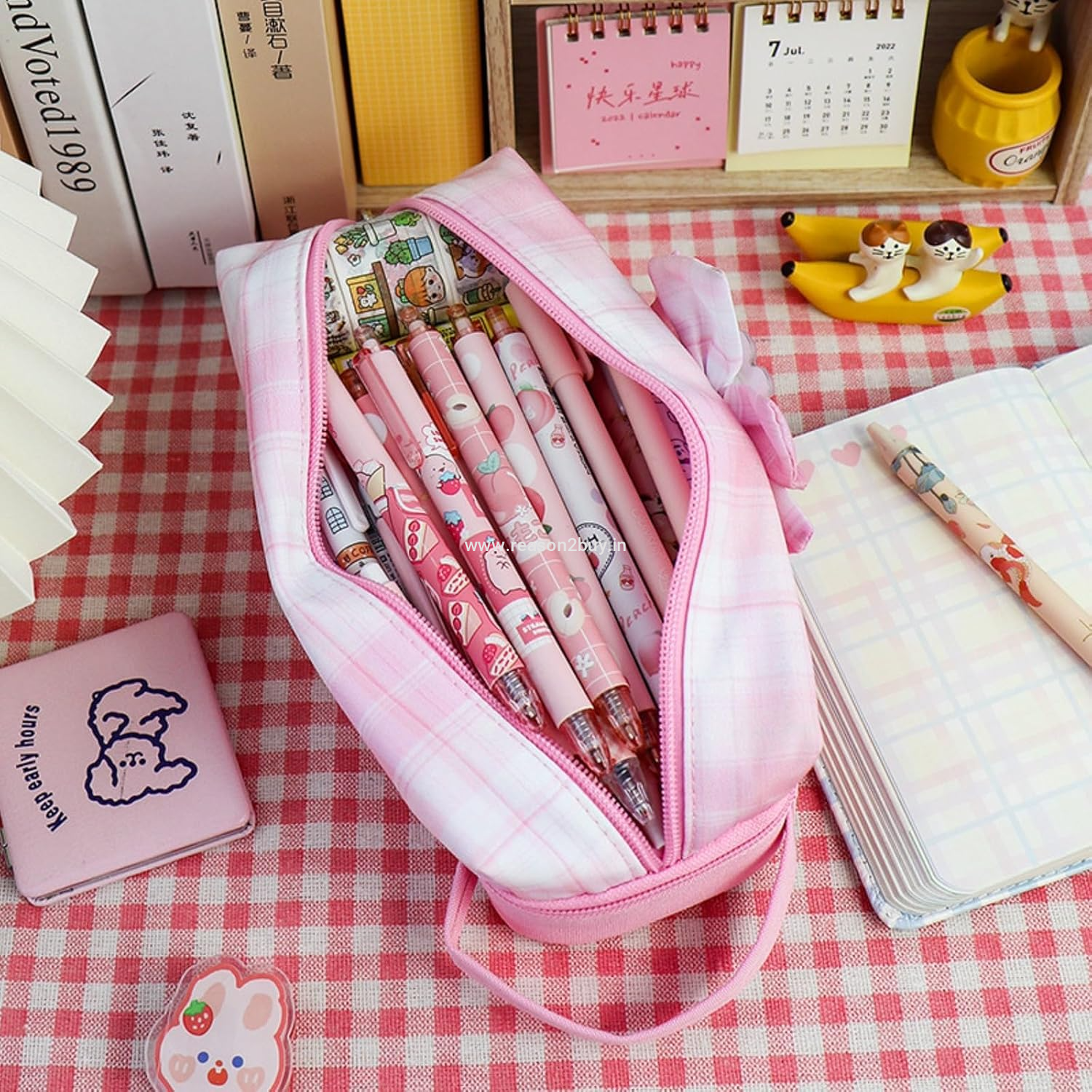 ---- A stationery bag is designed in college style, with cartoon patterns, plaid prints and bow decorations, exquisite workmanship and bright colors. There is a handle design, which is easy to carry.