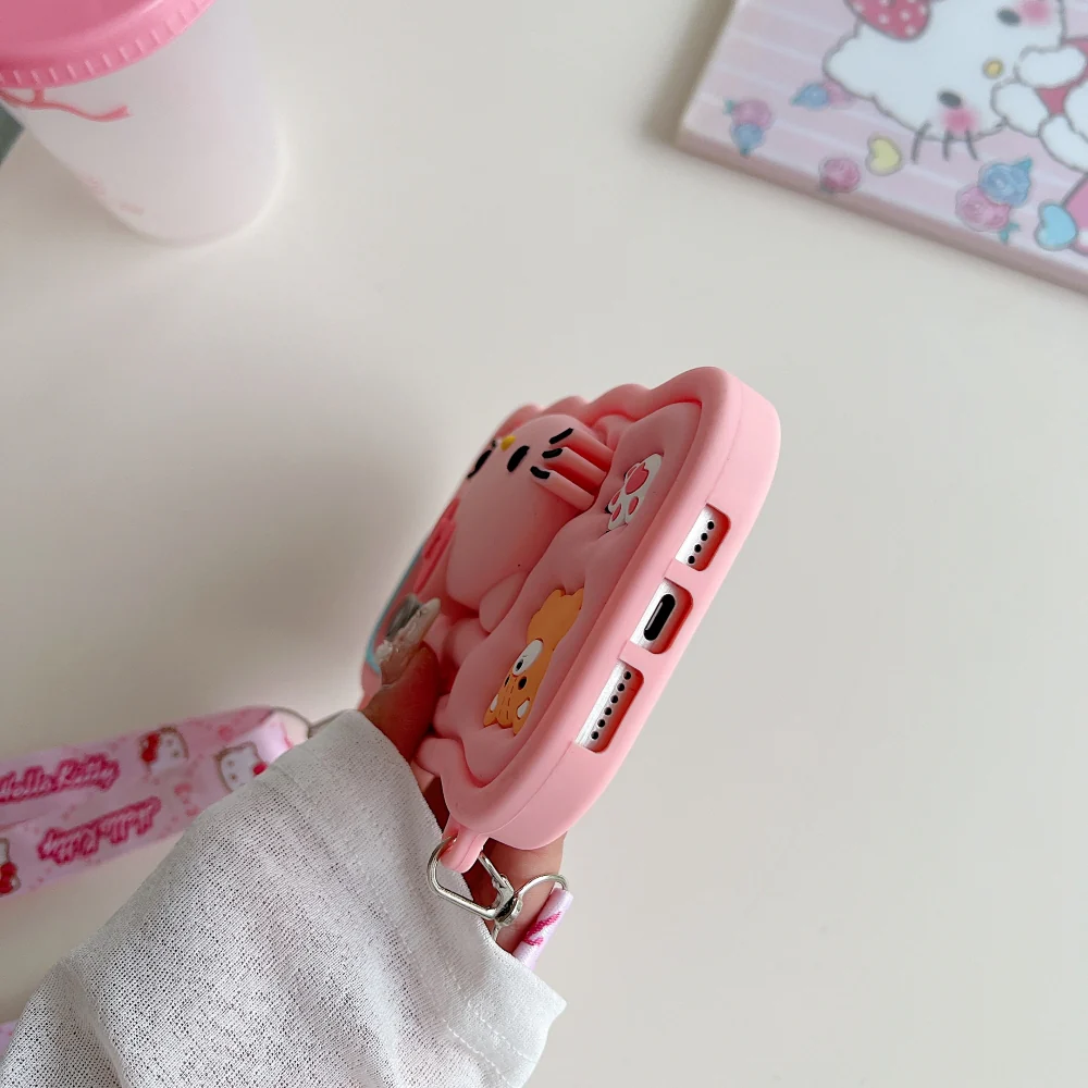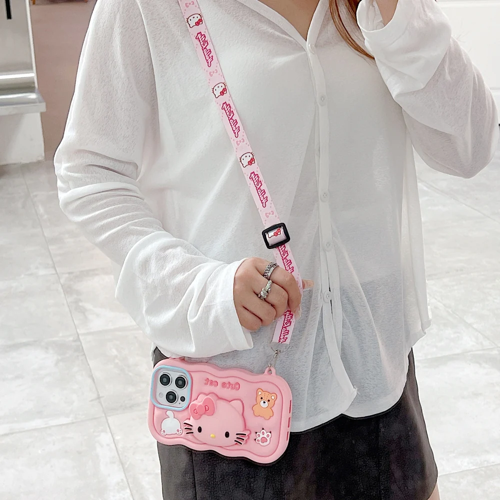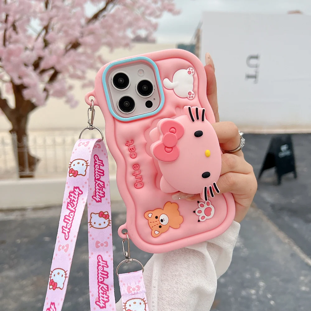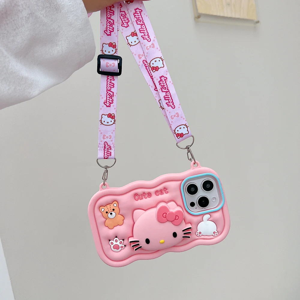 3D Cartoon Hello Kitty Case with Lanyard, Cute Cat Pink Soft Silicone Shockproof Phone Cover with Holder Strap, Stylish Fashion Aesthetic Back Case for Women and Girls (R2BS974)