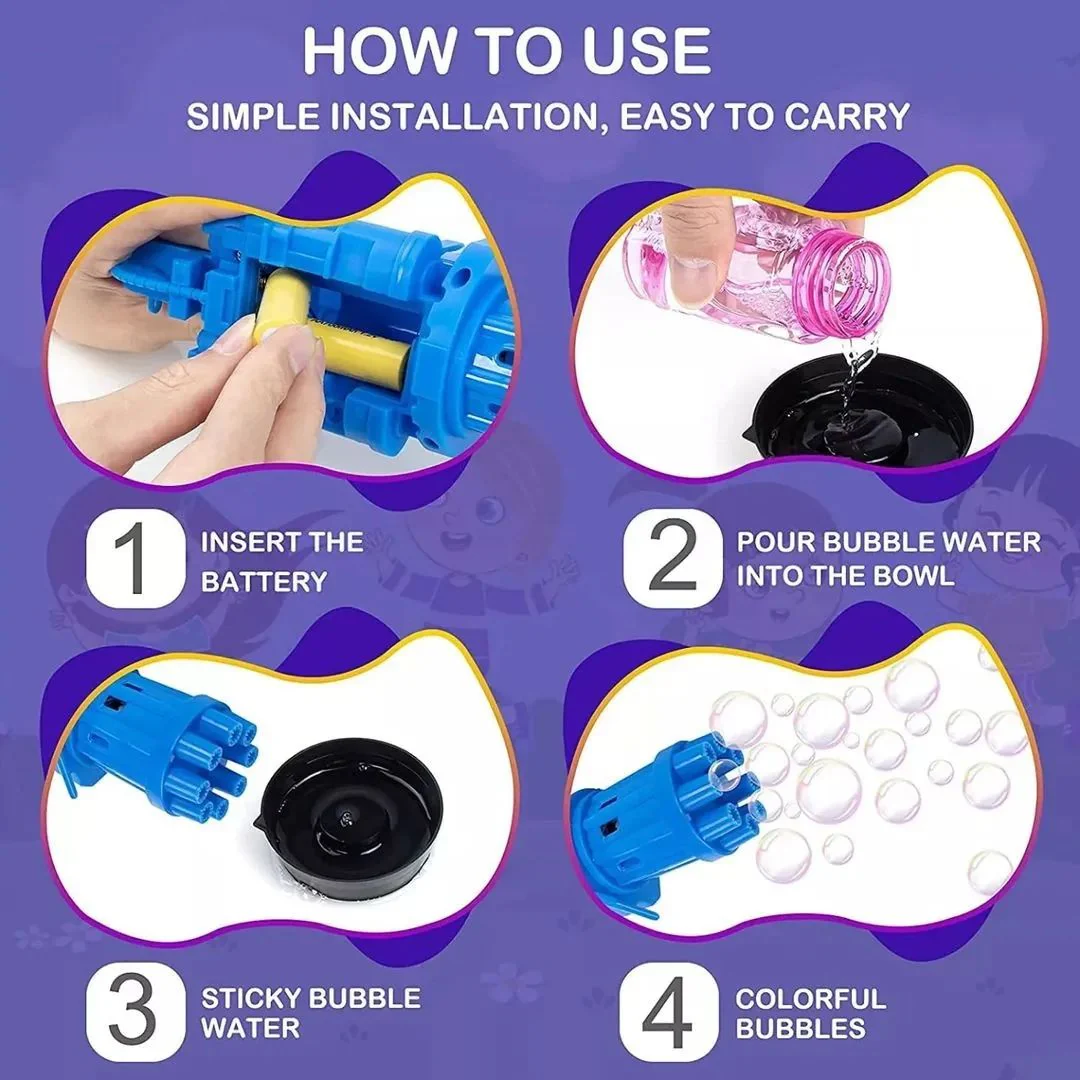 • You only need to install three AA batteries (not included), just pour the bubble water on the spare board, immerse the muzzle of the bubble gun in the bubble water, and then press the switch to enjoy the bubble time.