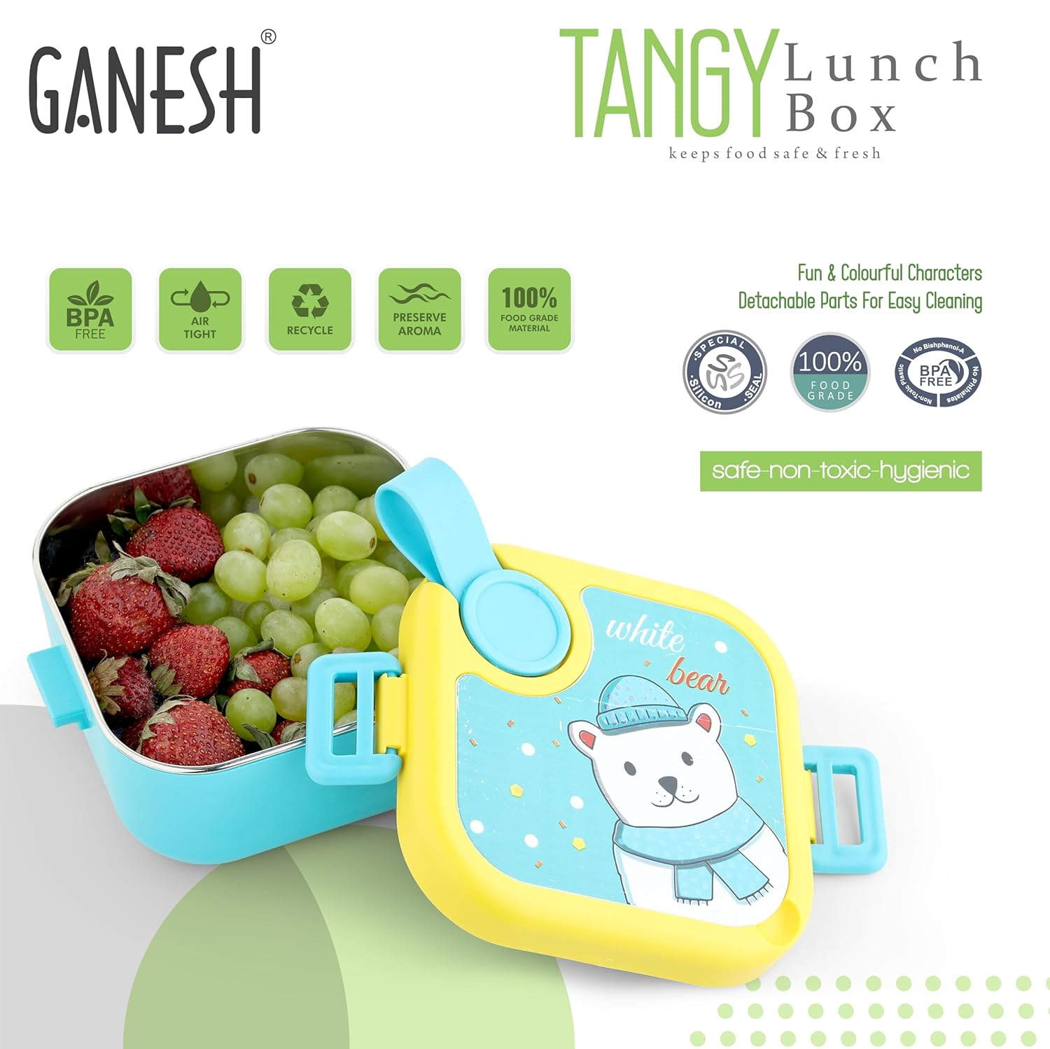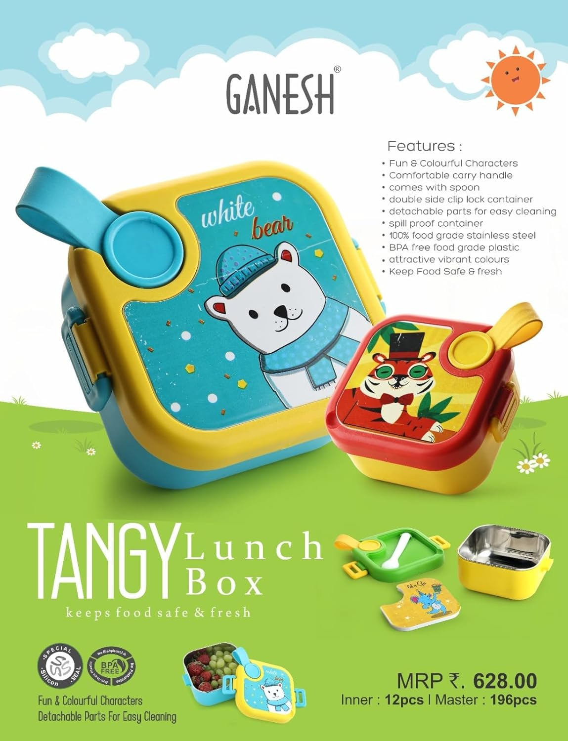 GANESH Tangy Inner Steel Lunch Box with Multi Sticker for Kids with Spoons Heavy Plastic BPA Free Food Grade Perfect for... -