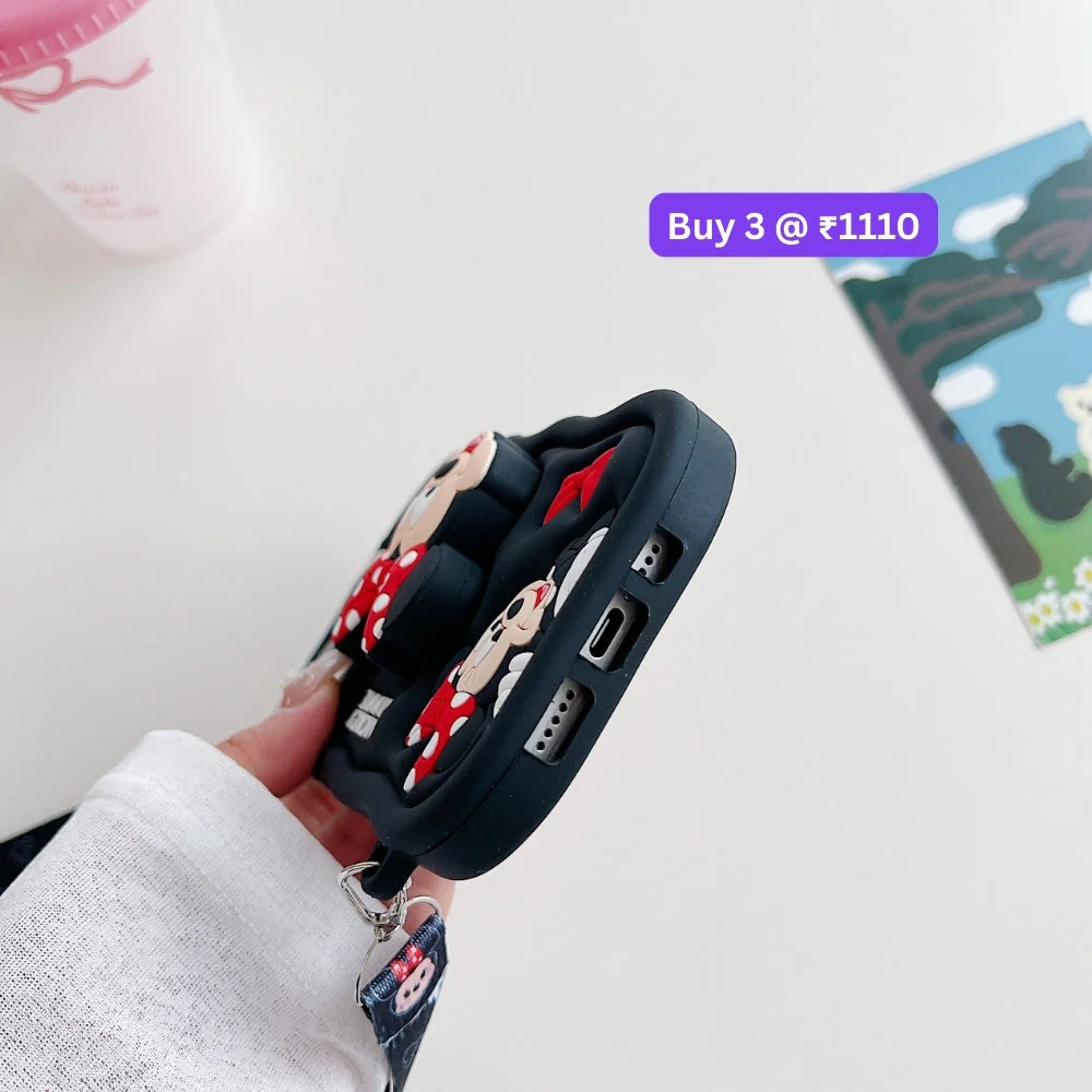 Minnie Cartoon Kickstand Phone Case with Shoulder Strap | Full Protective Soft Silicone 3D Holder Back Cover for iPhone (R2BS976)