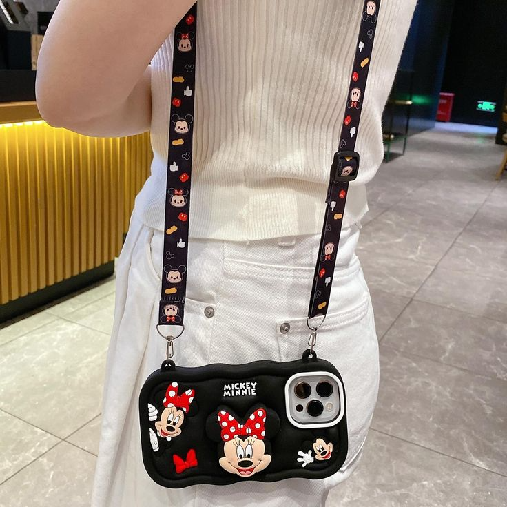 Minnie Cartoon Kickstand Phone Case with Shoulder Strap | Full Protective Soft Silicone 3D Holder Back Cover for iPhone ... -