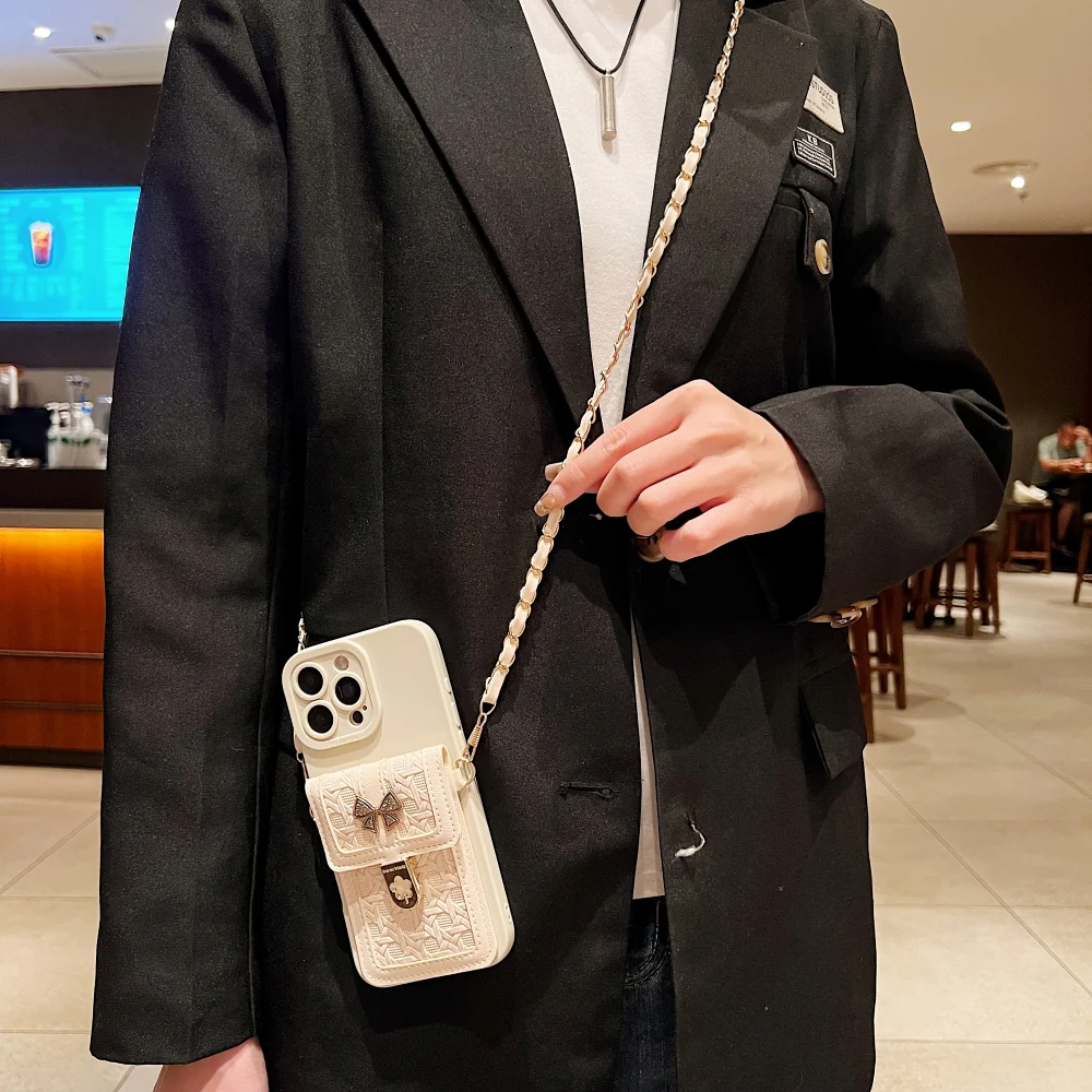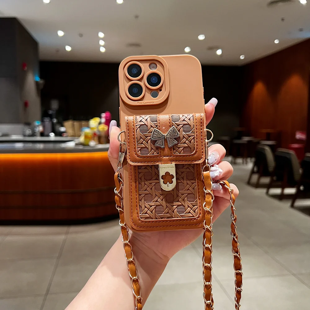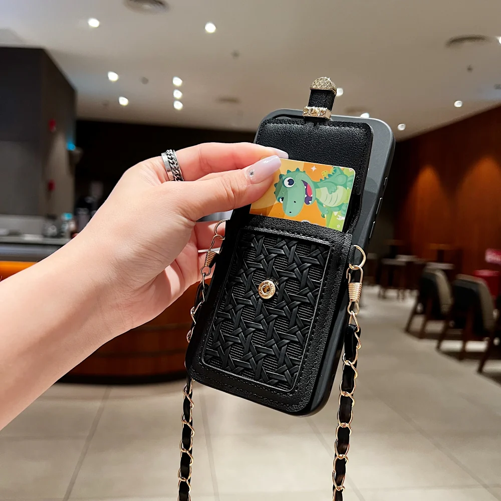 Combines fashion and function with a woven leather pouch, gold accents, and a detachable chain strap – perfect for hands-free convenience!