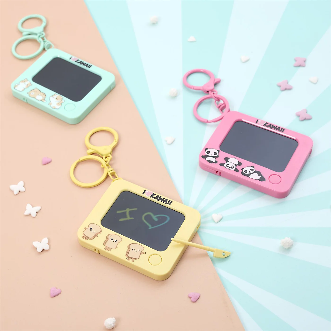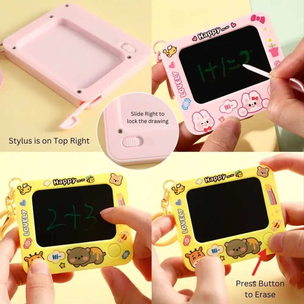 This miniature screen keychain is perfect for carrying a tiny writing board everywhere you go. It provides a compact and convenient way to jot down quick notes, reminders, or doodles on the go. With its functional buttons and cute design, this keychain makes everyday note-taking easy and fun! Product Features: Portable Writing Board: This miniature screen keychain is perfect for carrying a tiny writing board everywhere you go. It provides a compact and convenient way to jot down quick notes, reminders, or doodles on the go. Stylus Included: Each keychain comes with a plastic stylus, designed for ease of use, allowing you to write smoothly on the screen. The stylus can be neatly stored on the keychain for easy access. Dual Buttons: The mini board includes two functional buttons: Erase Button: Quickly erase all the text or drawings with the push of a button, making it ready for new notes. Lock Button: Locks the current content on the board to prevent accidental deletion, ensuring your notes or artwork stay intact until you’re ready to erase them. Cute Design: The keychain is adorned with adorable cartoon prints, adding a fun, playful vibe to your day. It brings a smile while being functional, making it a perfect accessory for kids or adults who love cute and quirky items. Package Contents: 1 * Erasable Screen Keychain Size: 6 cm x 4 cm x 4 cm